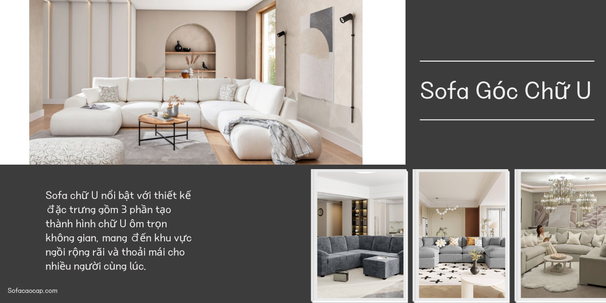 Thiết kế này đặc biệt phù hợp với phòng khách rộng trên 30m2, giúp lấp đầy không gian trống và tạo sự cân đối cho căn phòng quy mô lớn. Sofa chữ U thường có kích thước đáng kể với chiều rộng mỗi cạnh từ 2.0 đến 3.5m, đi kèm với các tính năng như tay vịn thoải mái, đệm ngồi sâu và phần tựa lưng êm ái, mang đến trải nghiệm thư giãn tối đa cho người sử dụng.