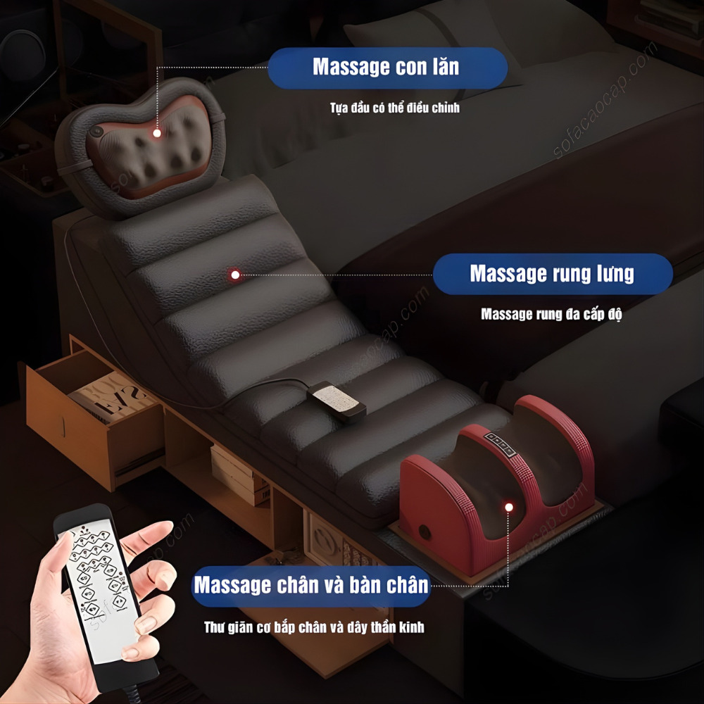 Đặc biệt, phần tựa đầu giường của giường ghế massage GM 025 còn được thiết kế thêm một hộc chứa đồ ẩn. Thoạt nhìn giống tựa đầu thông thường, nhưng thực tế anh chị có thể cất sạc điện thoại, kính mắt, thuốc nhỏ mắt hoặc sách đọc dở vào đây vô cùng tiện lợi.