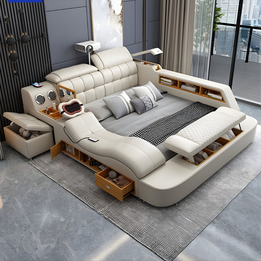 Ngoài ra, bên hông giường ngủ tích hợp ghế massage này còn trang bị 3 ngăn tủ chỗ thanh chắn giường và một hộc tủ ở phía đầu giường ẩn dưới tay giường. Đây chính là không gian lý tưởng để trưng bày những cuốn sách yêu thích. Tiện ích này cực kỳ hữu ích cho những đôi vợ chồng có thói quen đọc sách trước khi ngủ mà tủ sách chính trong nhà đã không còn chỗ trống.