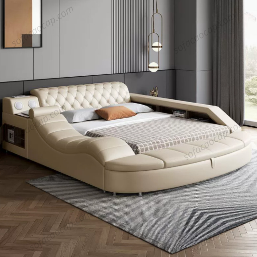 Đây đúng nghĩa là trải nghiệm “nhà thông minh” mà ai cũng mơ ước. Anh chị có thể vừa nằm tận hưởng massage, vừa mở những bản nhạc yêu thích qua hệ thống loa Bluetooth âm thanh cực mượt. Cần sạc điện thoại hay iPad để cày phim, đọc sách buổi đêm cũng chẳng cần phải lúi húi tìm ổ cắm xa xôi vì đã có ngay cổng USB ngay tầm tay. Mọi nhu cầu giải trí đều được gói gọn, giúp những giây phút nghỉ ngơi của hai vợ chồng trở nên thú vị và hiện đại hơn bao giờ hết.